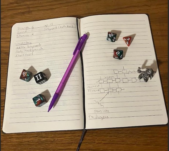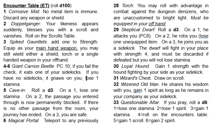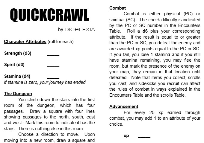 A fast-paced, one-page dungeon crawler experience for the solo adventurer. Roll your character, descend the stairs and start exploring. Collect items, cast spells, equip gear, engage in physical and spiritual combat, accrue xp and level up your stats. Requires polyhedral dice (or a dice app), a token to mark your character’s location, and a journal to map the dungeon.